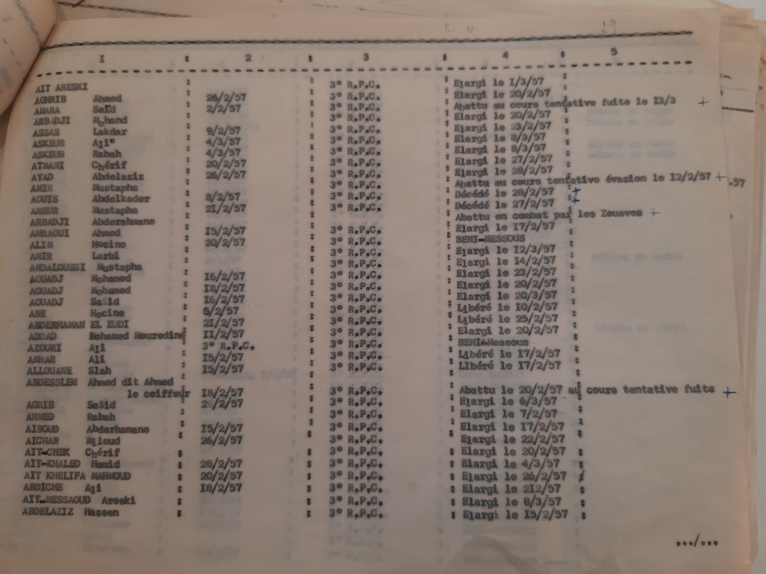 – Fichier des arrestations de janvier-février-mars-avril 1957 constitué par la 10e DP à partir des déclarations des différents régiments, Fond de la préfecture d’Alger, carton 91 1 K 1039, Archives Nationales d’Outre-Mer (ANOM / Aix-en-Provence, France).