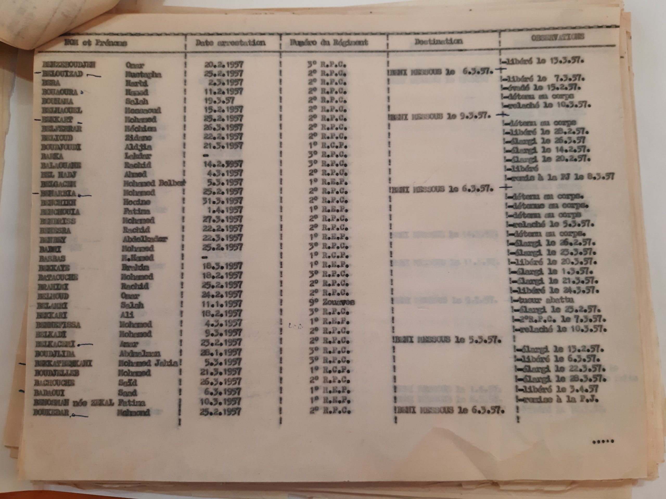 – Fichier des arrestations de janvier-février-mars-avril 1957 constitué par la 10e DP à partir des déclarations des différents régiments, Fond de la préfecture d’Alger, carton 91 1 K 1039, Archives Nationales d’Outre-Mer (ANOM / Aix-en-Provence, France).