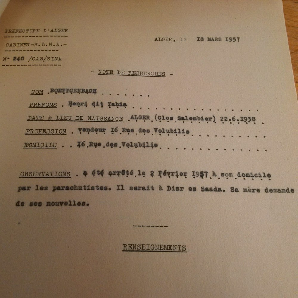 BOETTGENBACH Jean sylvestreseptembre 20180 Share on Facebook Share Share on TwitterTweet BOETTGENBACH HENRI dit YAHIA Né le 22/06/1938. Vendeur rue Volubilis. Enlevé le 2 février 1957 par des parachutistes. Pas de réponse de l’armée en octobre. (SLNA)