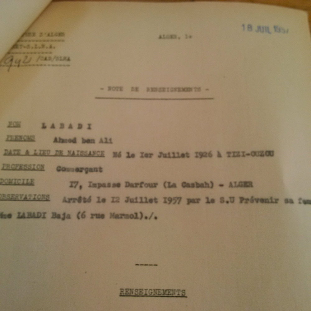 Dans leurs recherches, ses proches se sont adressés à la préfecture d’Alger. Deux fiches du Service des liaisons nord-africaines indiquent qu’il est né le 1er juillet 1926 à Tizi-Ouzou, qu’il est docker, qu’il vit 17 Impasse Darfour à Alger, et qu’il a été enlevé le 12 juillet 1957 par des agents en civils alors qu’il se rendait à son travail.